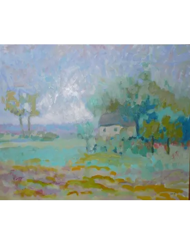 Cette peinture atmosphérique des années 1980 de Michel Paradis Sauval dépeint une scène rurale paisible et idyllique. Des champs aux couleurs douces et pastel s'étendent au premier plan ; le jaune, le vert, le violet et le bleu dominent le paysage. Au second plan, une petite maison blanche au toit gris apparaît, à moitié cachée par les arbres. Le ciel bleu pâle et les structures des arbres légèrement floues créent une profondeur atmosphérique.