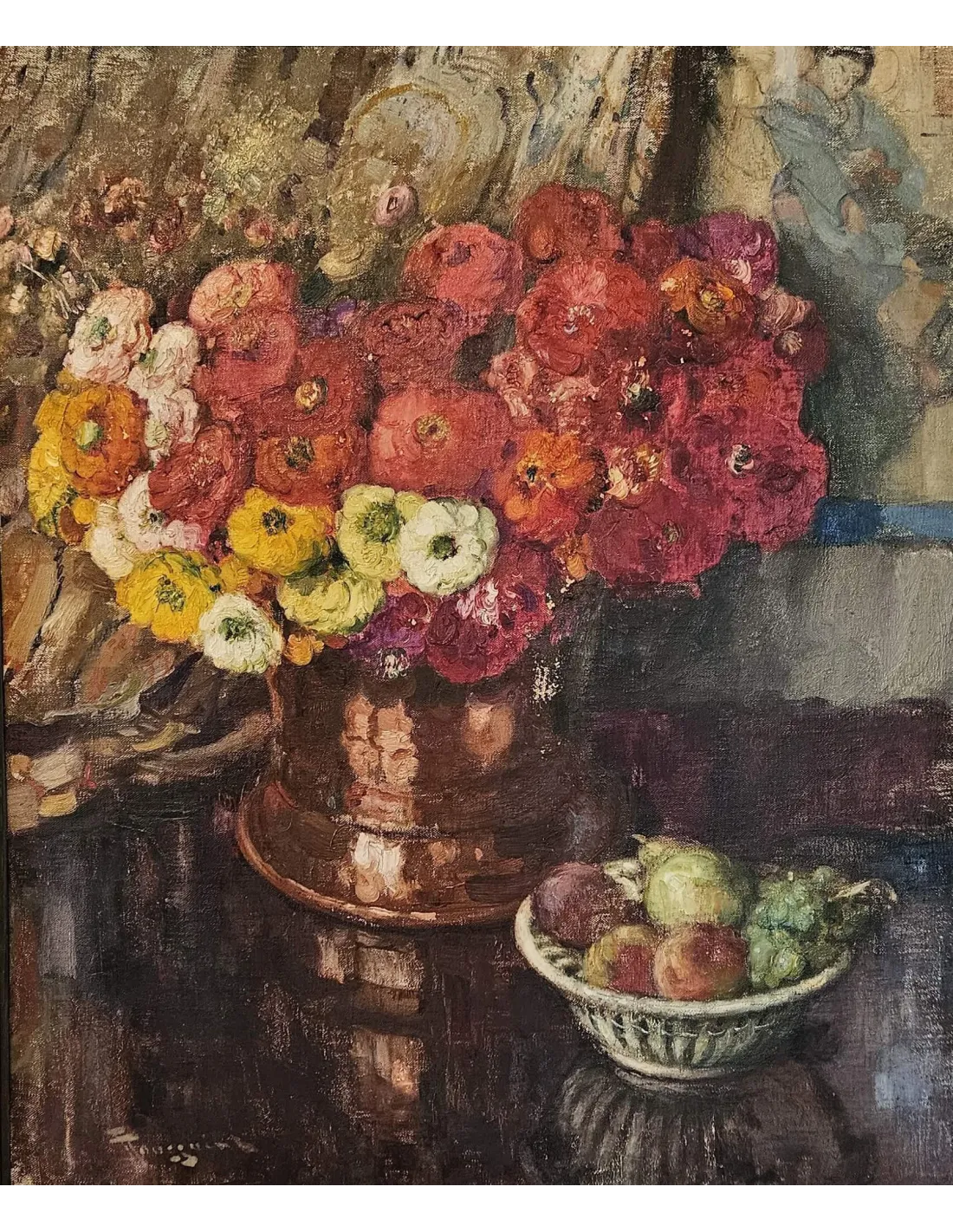 Le tableau de Toussaint est dominé par un bouquet opulent de renoncules colorées dans une lourde cruche en cuivre – dans des tons rouges chauds, jaune vif, rose et blanc. Les fleurs se dressent sur une table sombre et brillante, à côté d'un bol en céramique émaillée verdâtre contenant des fruits. En arrière-plan, une tapisserie richement décorée est suggérée, encadrant doucement la composition.