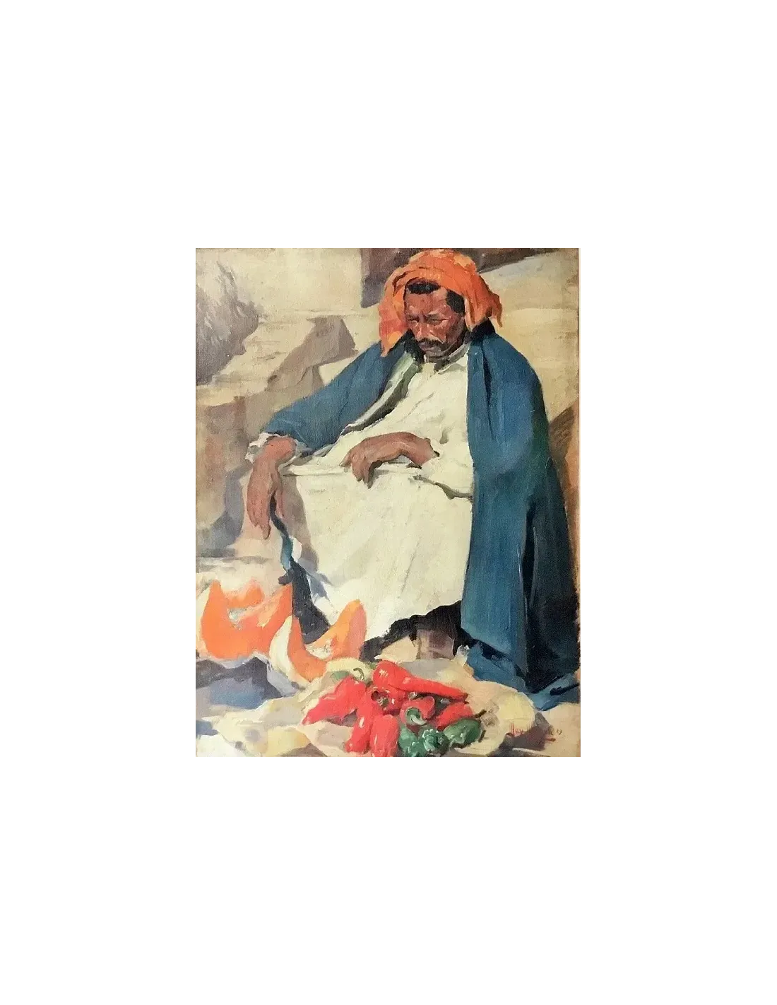 Au centre de la composition, un homme âgé, vêtu d'habits traditionnels, est assis sur une marche de pierre. Il porte une longue robe blanche (djellaba) et un ample manteau bleu par-dessus. Sa tête est recouverte d'un tissu orange noué à la manière d'un turban.