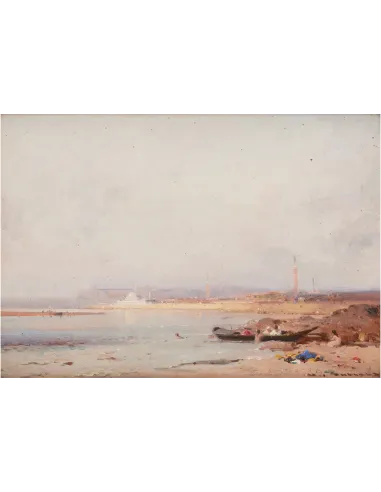 Au premier plan, de petites barques reposent sur une rive sablonneuse, tandis qu'au loin se dessine la silhouette de la ville, révélant minarets, dômes et de doux voiles de lumière.
