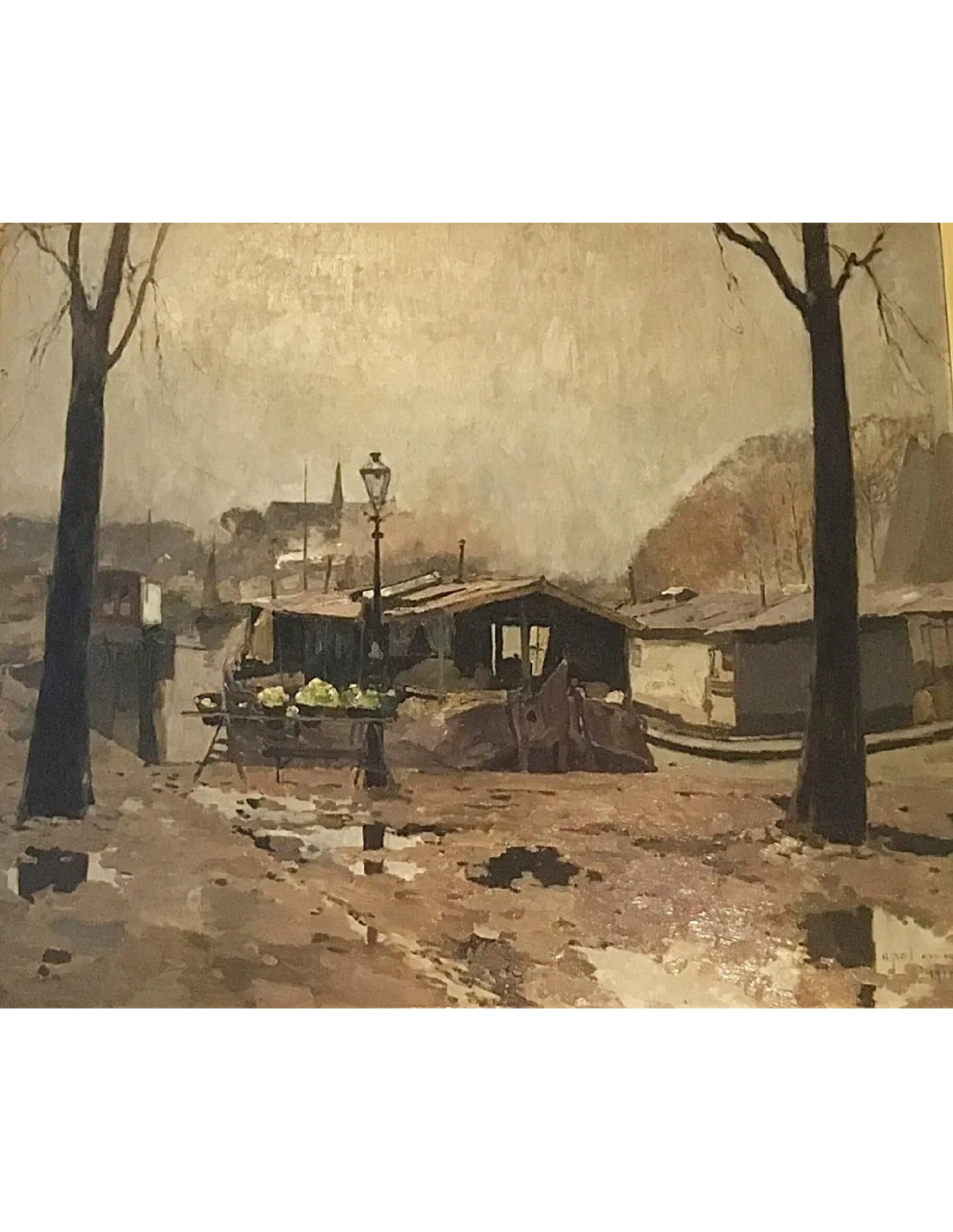 Cette peinture à l'huile atmosphérique d'Armand Apol de 1910 montre une rive hivernale dans des tons bruns et gris atténués. Deux arbres nus encadrent la scène, dans laquelle une péniche, une caserne et un étal de légumes sont alignés le long du quai. L'atmosphère brumeuse, la lumière retenue et les surfaces humides et réfléchissantes confèrent à l'image une intensité tranquille.