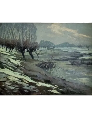 Ce tableau allie harmonieusement sens de la nature, représentation et technique. Il s'adresse aux collectionneurs et aux amateurs d'art à la recherche de profondeur émotionnelle, de valeur historique et de clarté esthétique dans une seule œuvre : un véritable objet de collection avec une authenticité historique qui représente le paysage hivernal tranquille sur la rivière Erft avec une profondeur impressionnante - idéal pour les amateurs de peinture de paysage émotionnelle avec l'histoire d'une œuvre.