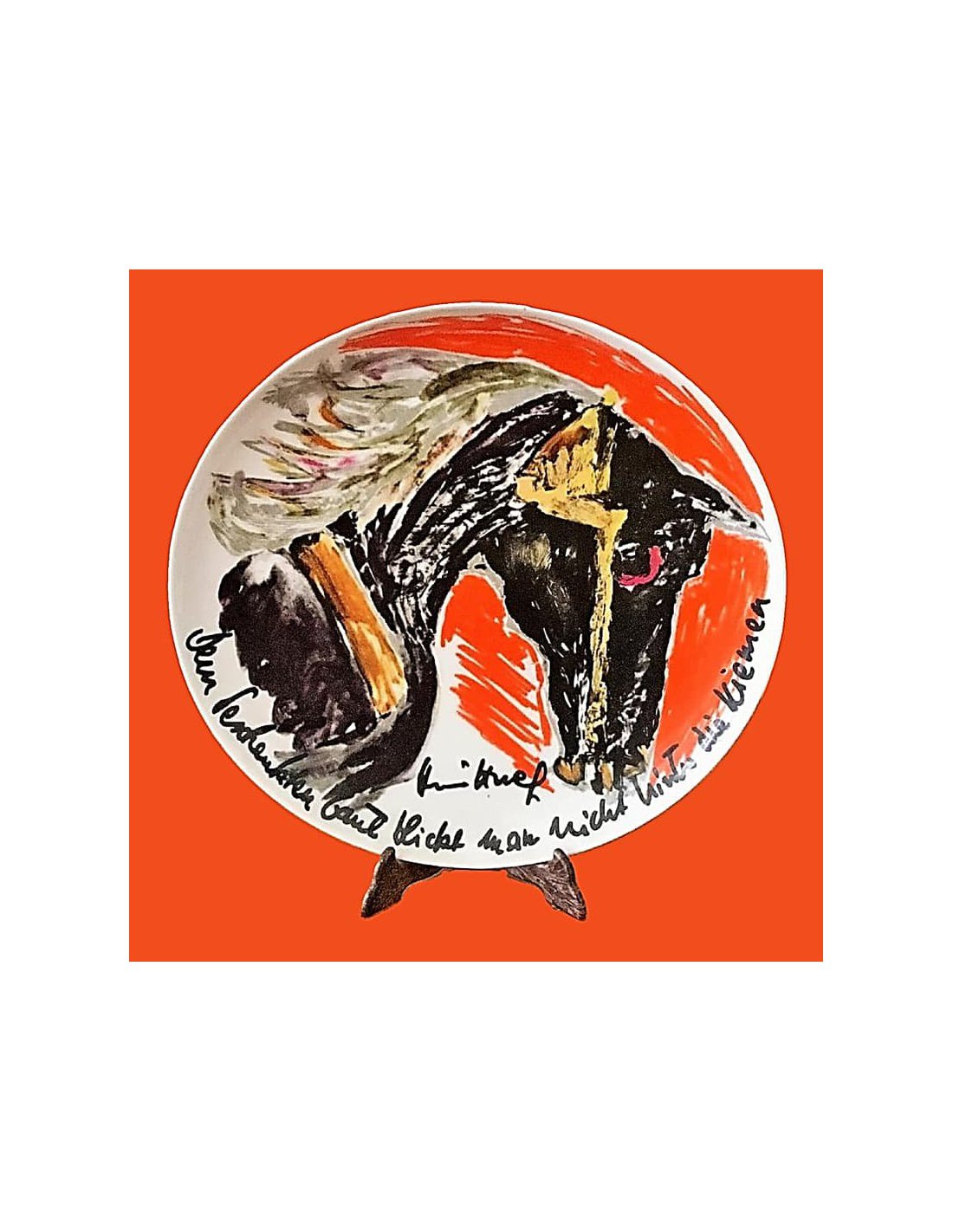 Ce jeu de mots ironique allie humour, individualité linguistique et esprit du temps de l'artiste. Comme toutes les assiettes de l'Édition d'artiste Rosenthal, cette pièce allie la tradition de porcelaine de haute qualité de la manufacture à la touche personnelle d'une personnalité exceptionnelle.
