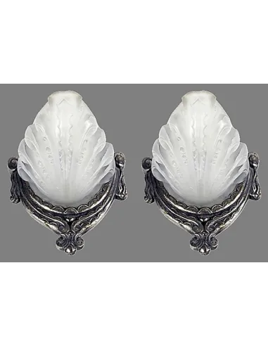Les douilles sont en bronze argenté et présentent des détails ornementaux en relief. L'association du verre et du métal reflète l'utilisation typique des matériaux de l'époque et confère à ces luminaires toute leur élégance.