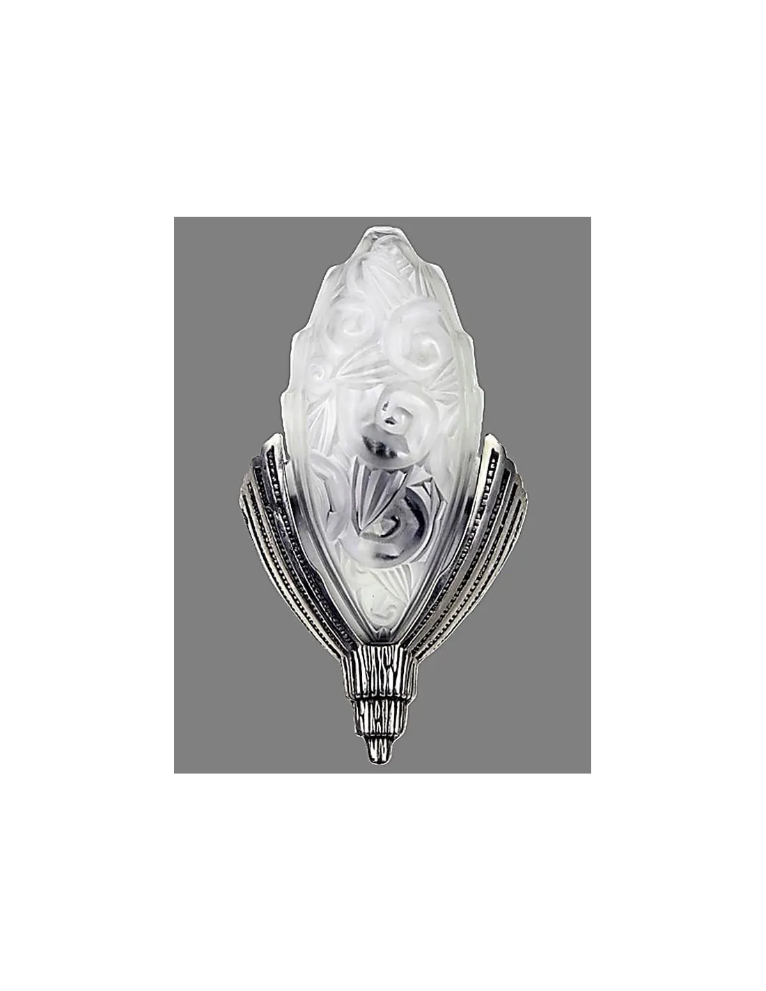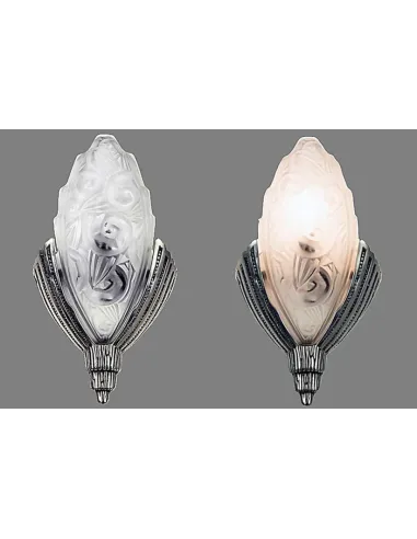 Les douilles sont en bronze argenté, ornées d'éléments finement gradués, à nervures verticales, se terminant par une extrémité effilée. Les abat-jour sont en verre opalin pressé et présentent un décor floral en relief.
