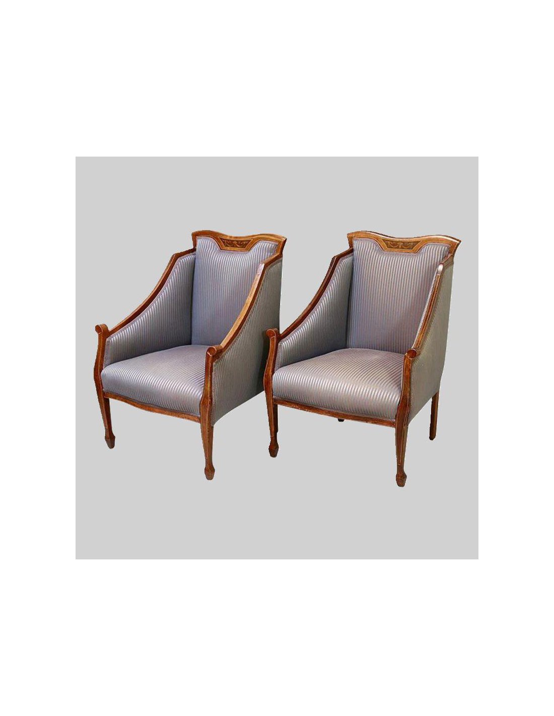 ART FLAGEY présente cet ensemble de trois pièces, composé d'un canapé et de deux fauteuils et réalisé en noyer avec de fines incrustations filigranes. L’architecture géométrique contraste avec les pieds galbés et les accoudoirs courbes, entièrement rembourrés. Le dossier du canapé est orné d’un panneau supérieur galbé avec une incrustation florale.
