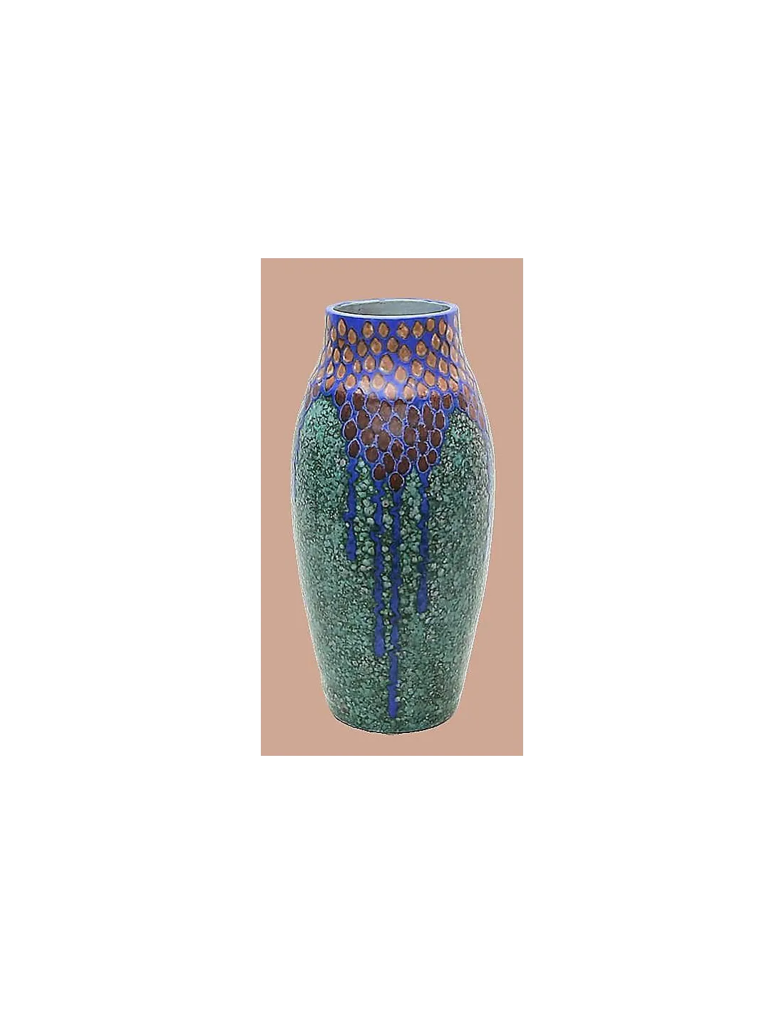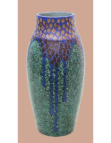 Ce vase est particulièrement remarquable par son émail exceptionnel: un champ de craquelures marbré verdâtre est parsemé de gouttes d'émail bleu cobalt, à l'aspect presque liquide, qui se fondent dans un motif géométrique en nid d'abeilles sur le col. L'association esthétique d'une surface organique et d'un ordre structuré rend ce vase véritablement unique.