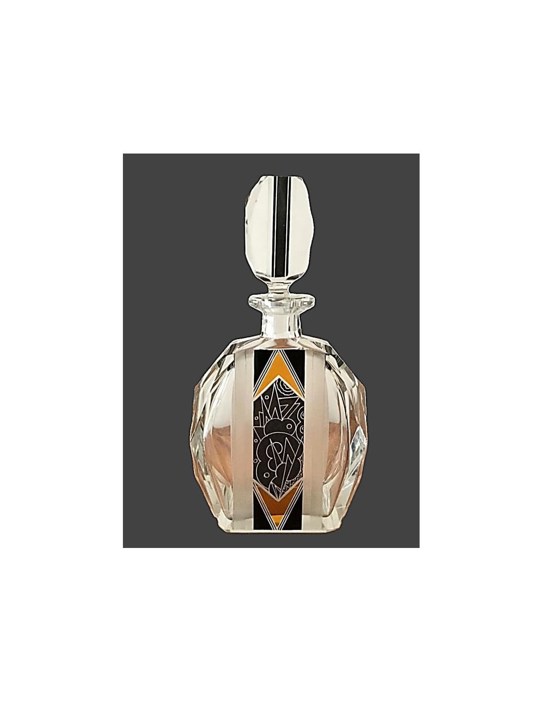 Les verriers de Bohême expérimentaient également des décorations innovantes en soudure noire et en émail, comme cette carafe, exemple caractéristique de la symbiose entre la verrerie traditionnelle de Bohême et le design avant-gardiste.