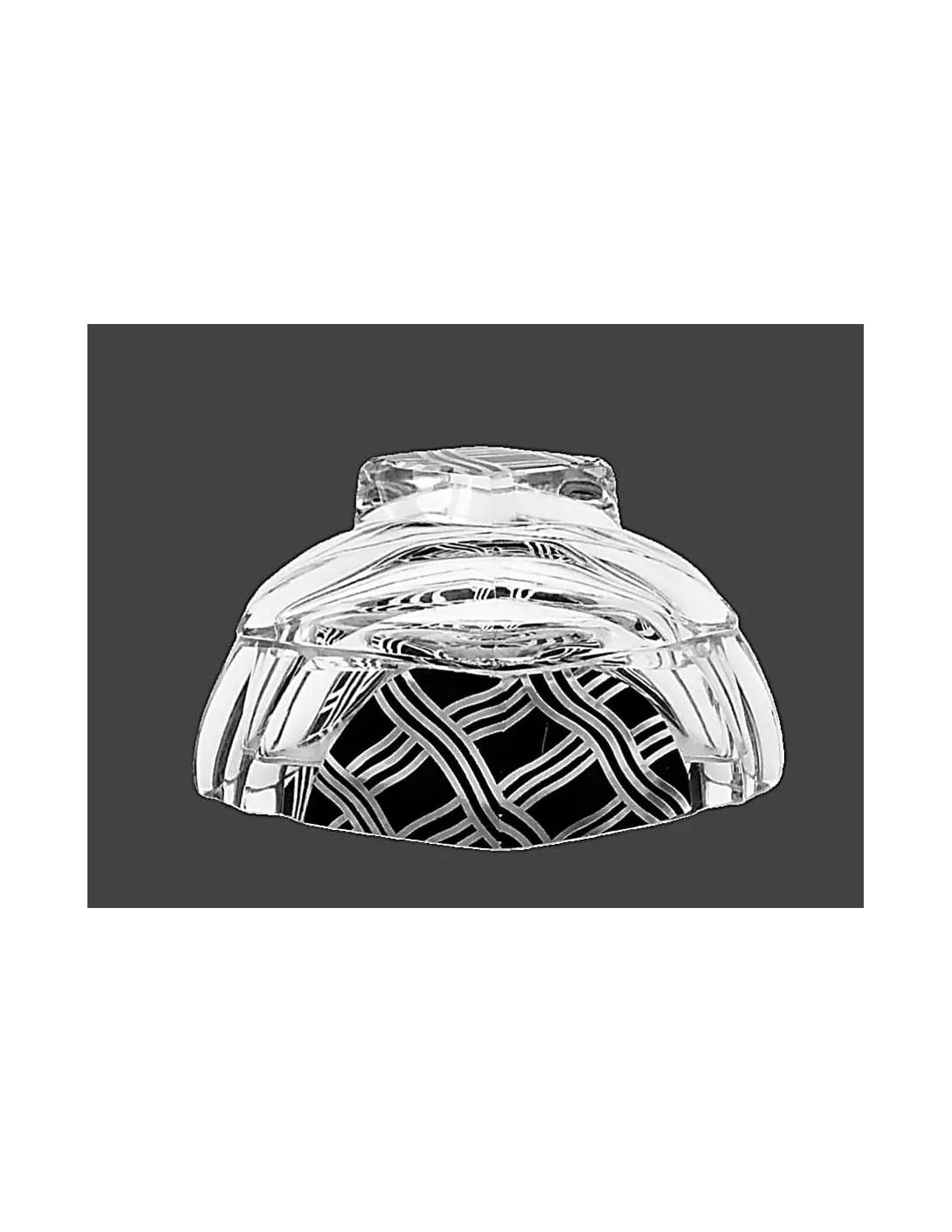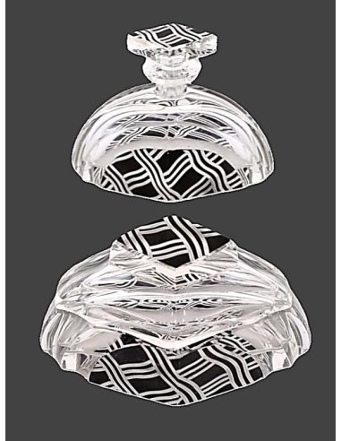 Élégant ensemble de toilette ou de boudoir Art déco composé d'un flacon de parfum et d'un poudrier en cristal incolore orné de motifs géométriques en émail noir. Le bouchon du flacon est facetté et le poudrier possède un couvercle légèrement bombé.