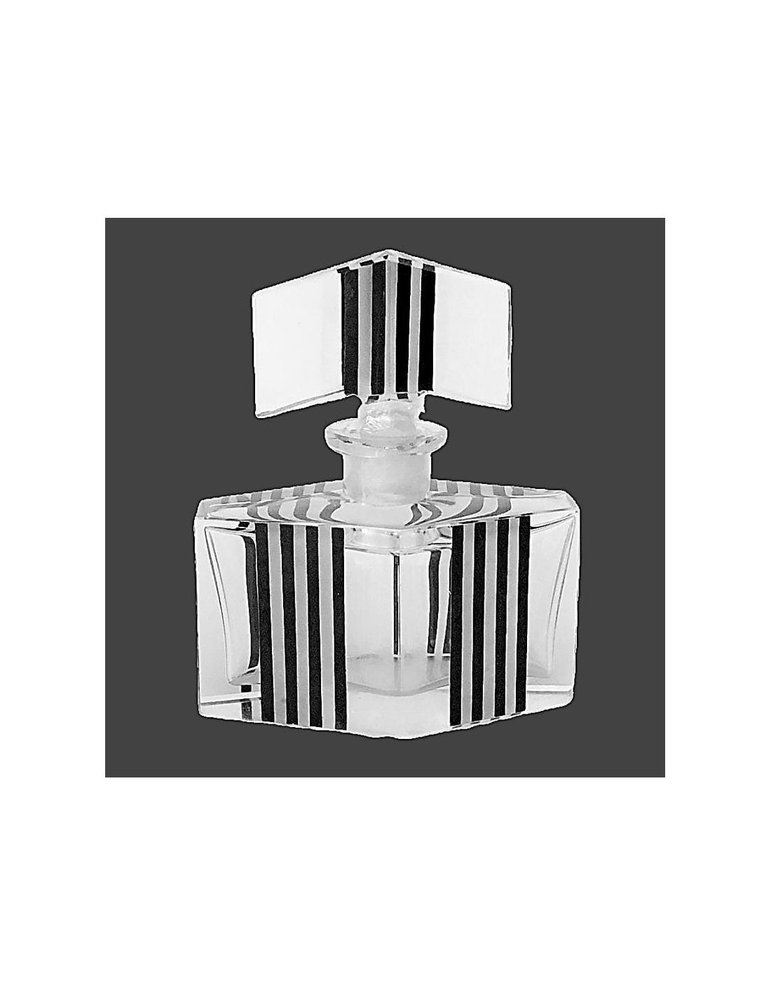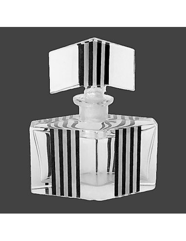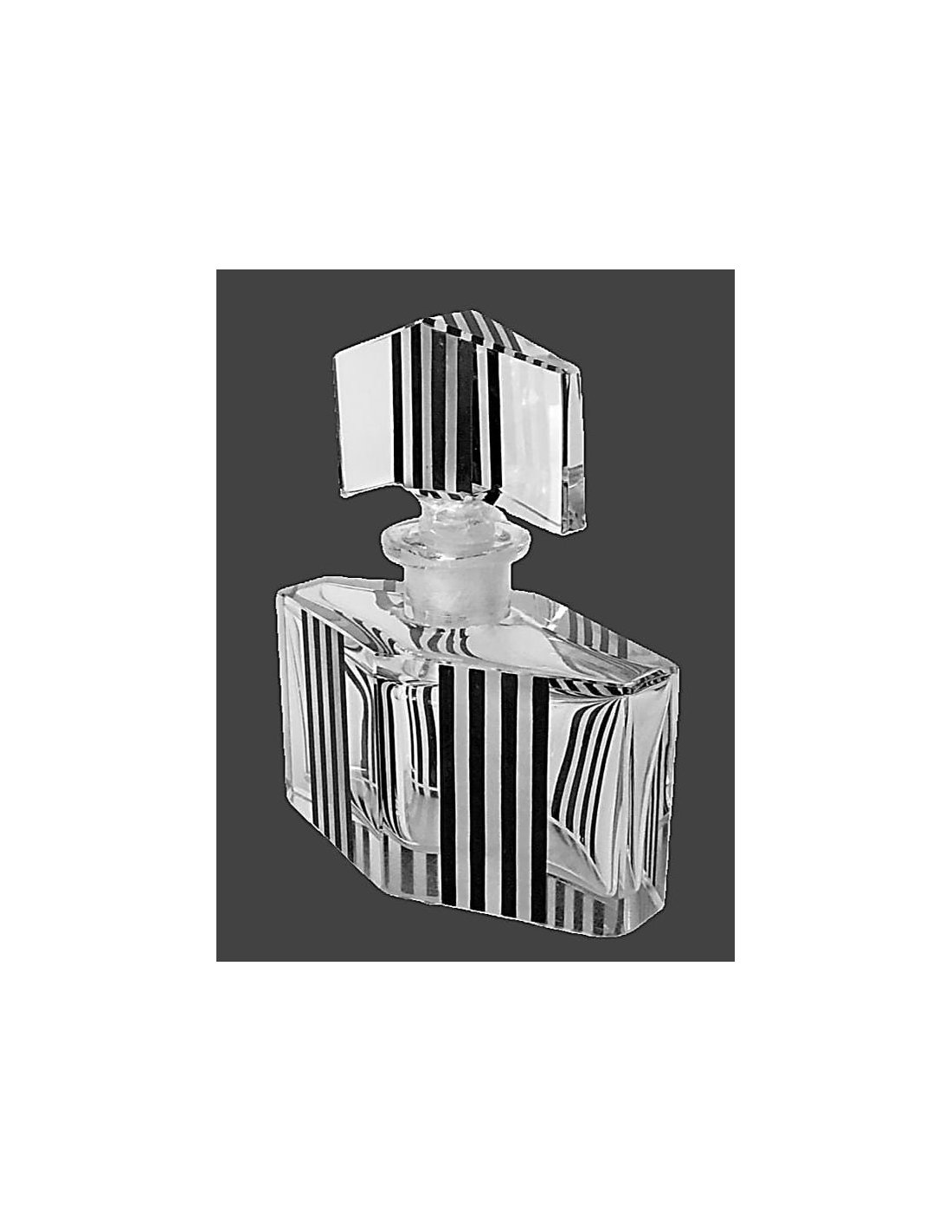 Ce flacon de parfum est un excellent exemple du design Art déco des années 1930. Fabriqué en cristal de Bohême facetté de haute qualité, il impressionne par sa forme géométrique épurée et l'alliance élégante de sa transparence et de son décor de rayures verticales noires peintes à la soudure noire.